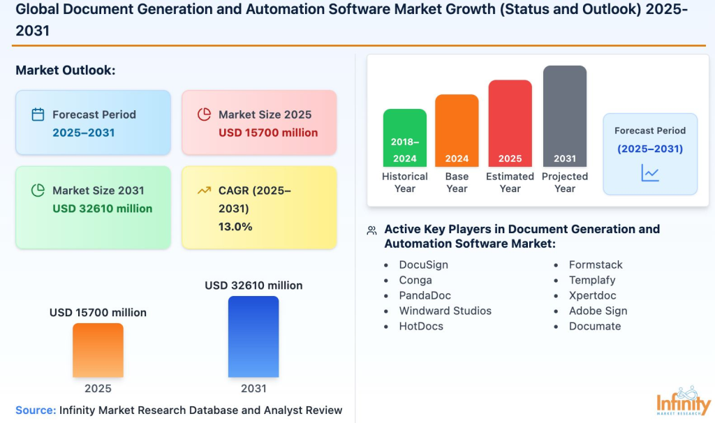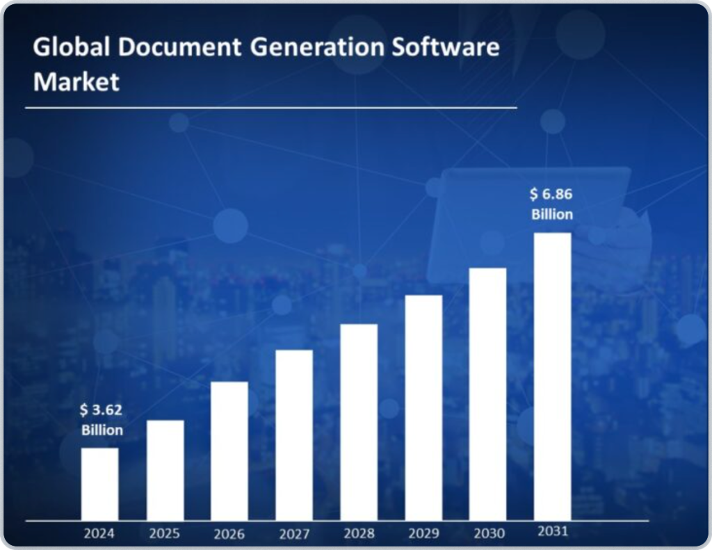 – When you zoom out to the broader document generation and automation software market, the numbers get larger. It’s projected to grow from USD 15.7 billion in 2025 to USD 32.6 billion by 2031 at a CAGR of 13%.