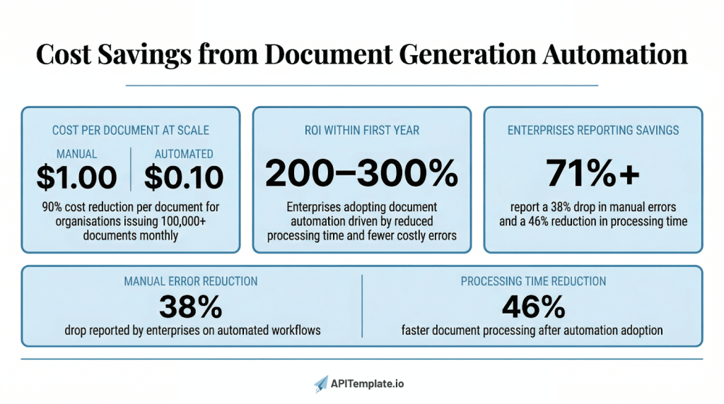 – Enterprises adopting document automation often see 200–300% ROI within the first year, driven by reduced processing time and fewer costly errors.