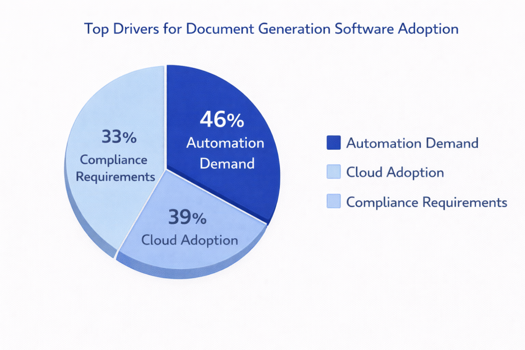 – The top three drivers pushing businesses toward document generation software adoption are automation demand (46%), cloud adoption (39%), and compliance requirements (33%).
