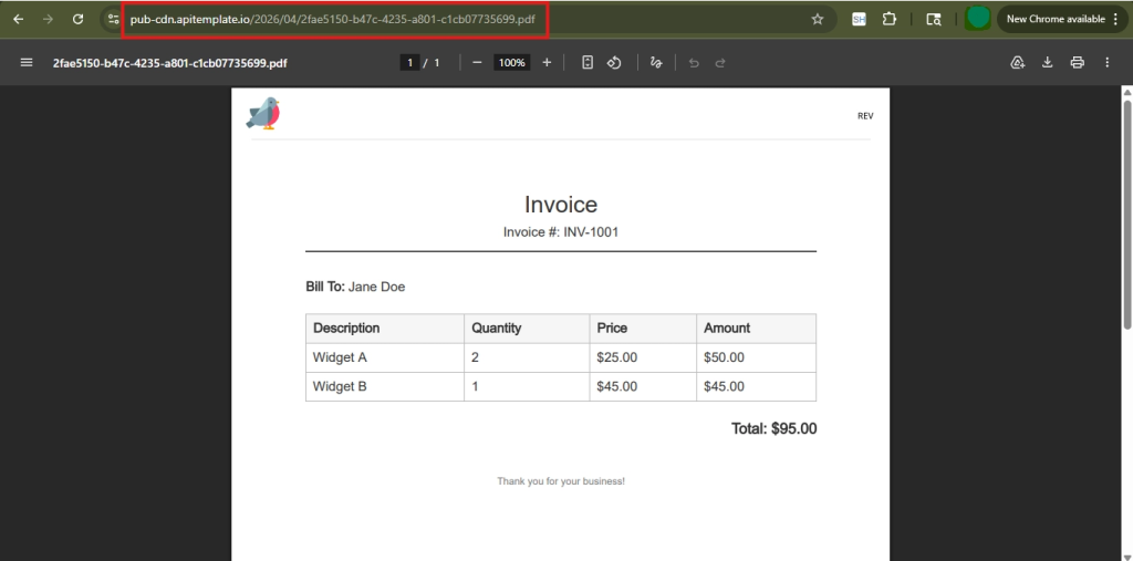 5. Copy that URL and open it in your browser, you should see your generated PDF with all the template variables filled in with your test data.