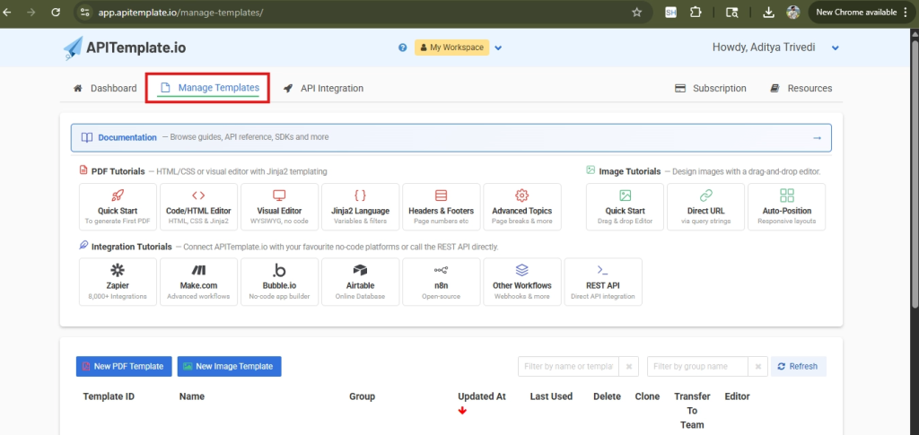 - Once logged in, you’ll see three tabs at the top: Dashboard, Manage Templates, and API Integration. Click the Manage Templates tab.