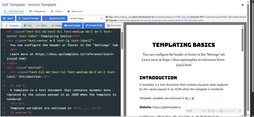 - You’ll now be inside the HTML Editor. You’ll notice two tabs at the top: HTML and CSS. The HTML tab is for your markup and template variables, while the CSS tab is for your styles. Add template variables – these are placeholders in your HTML that get replaced with real data when the PDF is generated. For example,