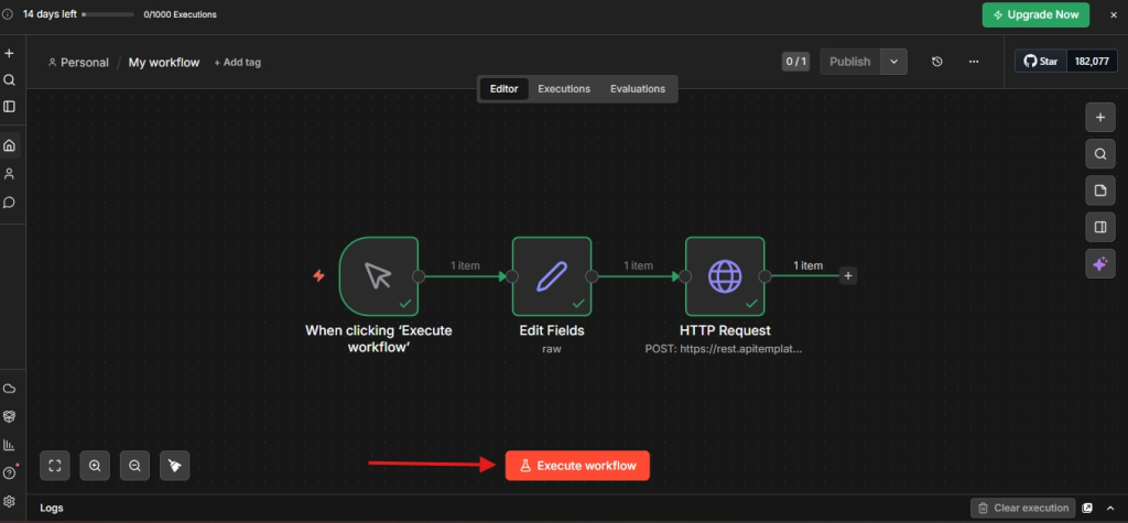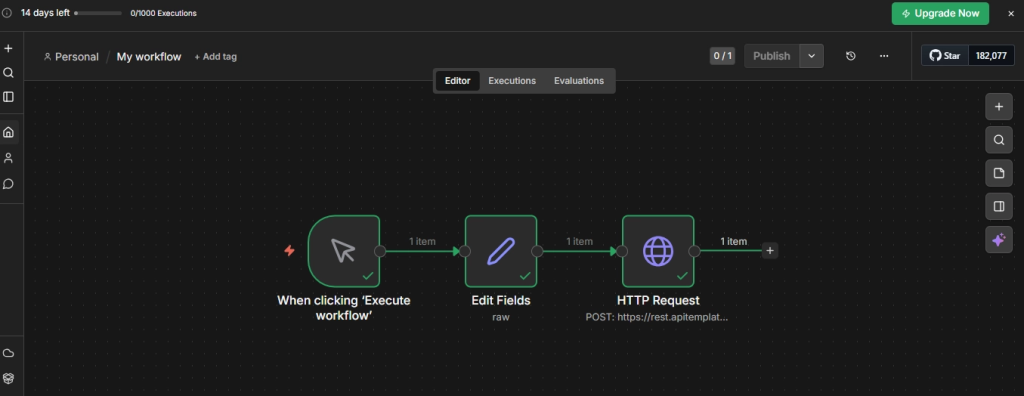 - Make sure all your nodes are connected left to right: When clicking ‘Execute workflow’ -> Edit Fields -> HTTP Request (and optionally a delivery node).