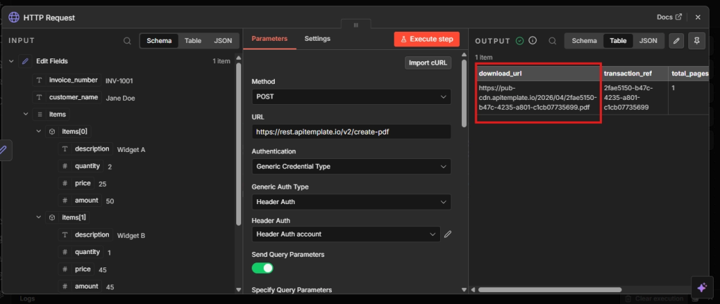 Now connect an HTTP Request node that sends your data to APITemplate and gets a PDF url back. See the API reference for all available parameters.