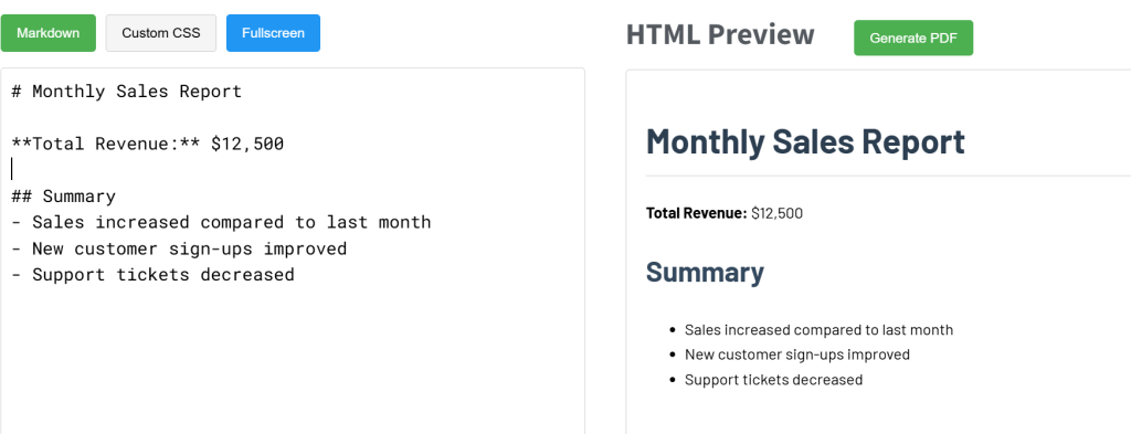 The tool is completely free to use, includes a live editor so you can see how the PDF will look before you generate it, and is ideal for simple reports or text-focused documents where you just want a quick, clean PDF output. Let’s try our markdown example in the editor